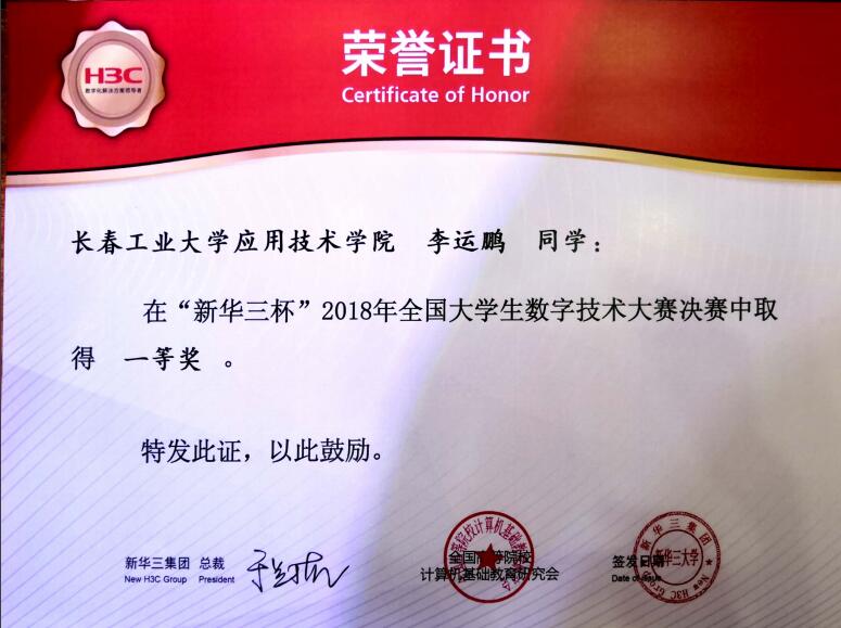 2018年11月30日至12月4日,由紫光旗下新华三集团和全国高等院校计算机基础教育研究会联合主办的2018年“新华三杯”全国老员工数字技术大赛全国总决赛在杭州举行。公司网络技术专业5名同学在参加总决赛的200名选手(本科、专科员工各100名)中,表现出色,经过激烈角逐,最终取得了高职组(李运鹏、倪凯)一等奖1项、三等奖1项、本科组(冯伟鹏、徐希平、郭伟)三等奖3项的好成绩。